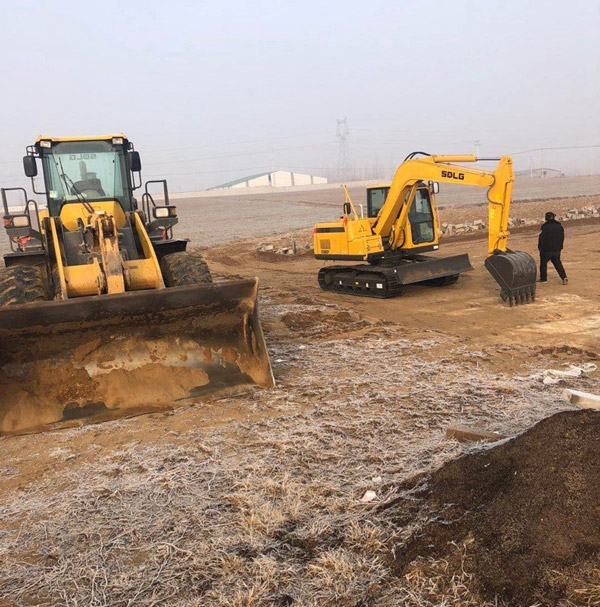 买来挖机第一次干活就是一个硬菜,要做烟草育苗大棚的场地平整。由于地势南高北低,需要挖高填低,需要铲车和挖机就同时上阵,挖机挖土,铲车运土,后期挖机精平。这个活儿,赵老板一个人就完成了,从铲车到挖机,他用了三、四个月就过渡好了。