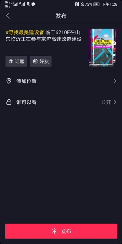 选取多张不同角度的设备施工的照片,通过抖音上传并配上炫酷背景音乐。发布时,在标题里写好您是临工什么设备?在哪?干啥活?