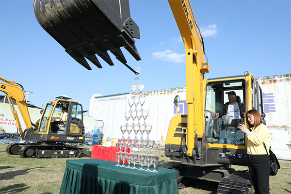 同样,在活动现场,我们见到在抖音快手平台拥有百万粉丝的挖机女神“娜娜”前来助阵。并迎战好司机冠军学员高脚杯叠罗汉,pk之后娜娜说:看着容易,做起来难!必须全神贯注,产品协调性也得足够给力,临工冠军学员确实不一般!