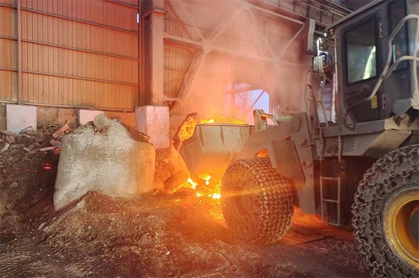 一台临工装载机轮胎上裹着防滑链冲进车间,在发动机的轰鸣中,铲斗猛地扎进火红的渣堆,铲出一斗冒着火苗和白烟的钢渣,碾压着烧红的地面,在火花四溅中把它转运到另一个车间,然后掉头再次冲向“火焰山”。