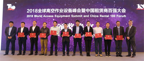 (临工重机董事长于孟生(左一)为2018中国高空作业设备租赁商10强颁奖)