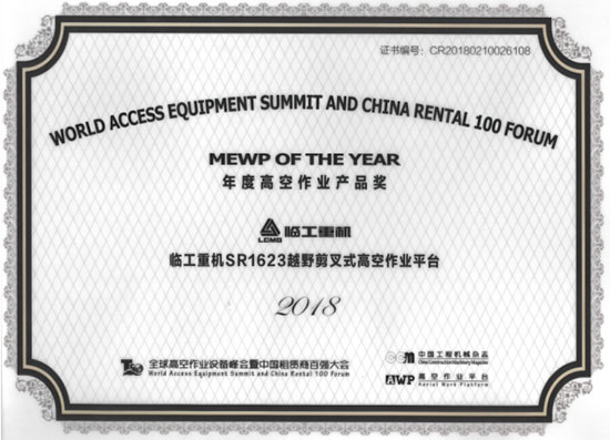 同时,临工重机SR1623越野剪叉式高空作业平台凭借高稳定性、高可靠性、动作响应快、设计紧凑等特点获得“年度高空作业产品奖”。