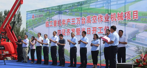 活动最后,高新区管委会领导和和公司班子成员共同按下启动钮,现场响起了挖掘机工作的轰鸣声,宣告公司年产三万台高空作业机械项目正式启动,标志着临工重机在高空机械项目上又迈出了坚实的一大步。