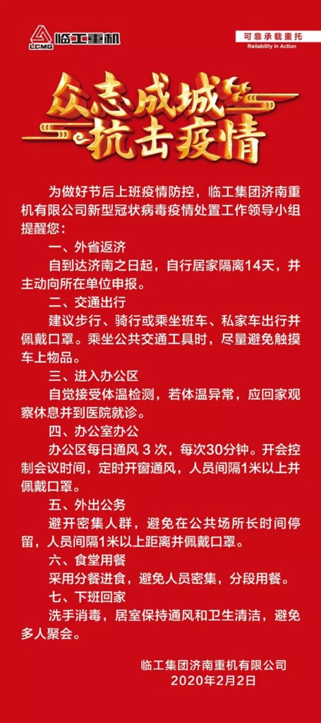 复工不是拐点,对我们的考验才刚刚开始。公司要求各部门、子公司加强防疫管控,措施落实到位,严格执行公司发布的《关于落实工作期间新型肺炎防控措施的要求》,坚持网格化管理,每天多次排查,坚持日报制度并逐级上报。公司全体员工要凝心聚力,坚定信心,营造良好的工作、生活环境,攻坚克难,共渡难关。