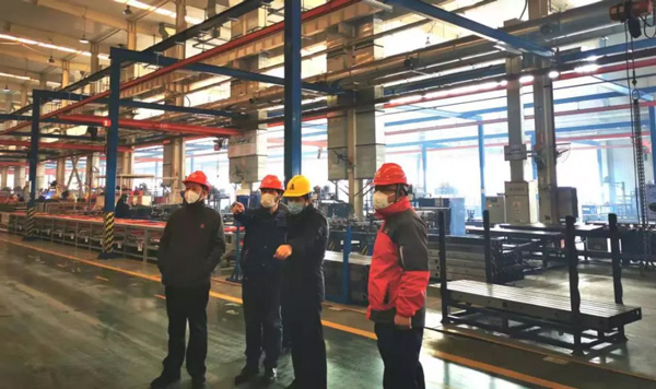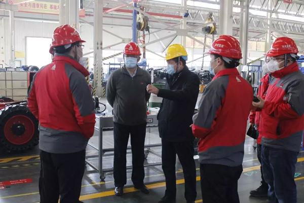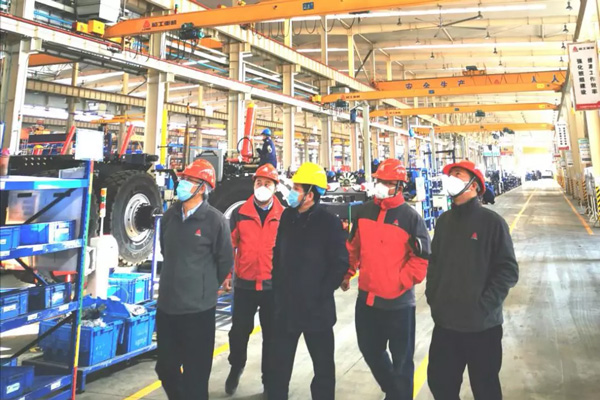 来到总装车间剪叉高机、矿机生产线,察看整机装配情况。于总要求在做好员工防疫防护的同时质量意识不打折,严把质量关,确保下线产品质量,满足市场订单需求。当下,务必做好两个保障项目:1、全力保障疫情防控项目;2、全力保障国内和国外市场订单,保障重点疫区医院等防疫设施建设所需的高空作业设备订单,保障重点矿区矿用车需求,尤其是涉及国计民生的发电供热所需煤炭开采矿区的需求。