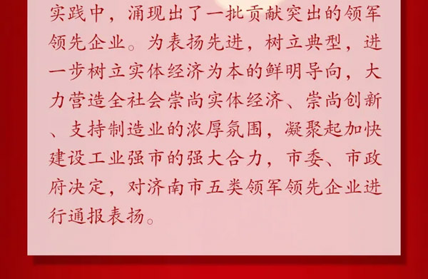 7月9日下午,济南市委市政府召开加快建设工业强市动员大会。为表扬先进、鼓舞士气、大力营造全社会崇尚实体经济、崇尚创新、支持制造业的浓厚氛围,凝聚起加快建设工业强市的强大合力,会上对先进制造业领军企业、数字经济领军企业、新制造业领军企业、新经济领军企业、实体经济领先企业等五类共200家领军领先企业进行通报表扬。临工集团济南重机有限公司入列先进制造业领军企业名单,受到表彰。