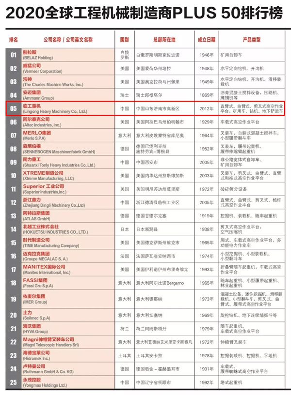 “2020年全球工程机械制造商PLUS50强榜单”正式发布。中国高空作业设备、矿山设备制造商临工重机跻身前五强,在入榜的9家中国工程机械制造商中,排名最高。