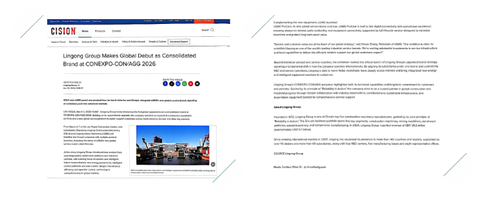 据不完全统计,自3月2日展会预热至3月9日展后发酵,与临工集团相关的原发及转载报道累计约1056篇次,新闻稿触达量超2.35亿人次。这组数据背后,不只是传播效果的胜利,更是中国工程机械向世界传递实力、重塑认知的一次重要突破。