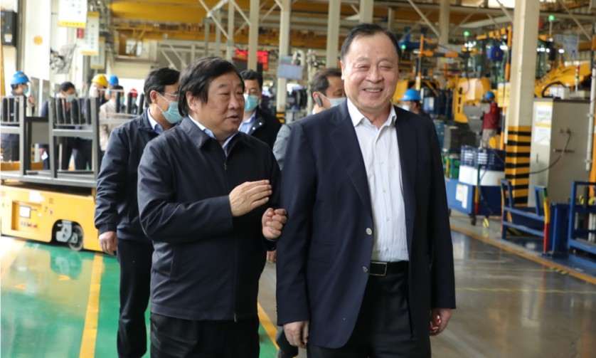 参观过程中,董事长王志中介绍了临工近年来的发展情况,尤其是精益生产和全员创新方面取得的重要成果。谭旭光边走边看,不时驻足询问交流,对公司取得的发展成绩表示充分肯定,对遍布生产现场的AGV自动转运车及各类智能机械手、焊接机器人等技改创新成果给予高度赞赏。在挖掘机总装流水线,他详细了解了配备潍柴发动机的临工挖掘机产品的性能参数及质量表现。